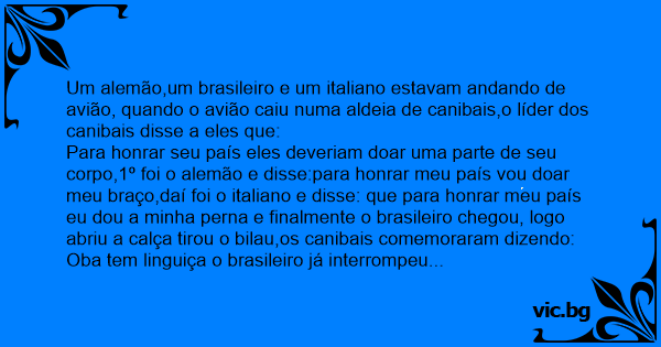 Para honrar seu país eles deveriam doar uma parte de seu corpo,1º foi o alemão e disse:para honrar meu país vou doar meu braço,daí foi o italiano e disse: que para honrar meu país eu dou a minha perna e finalmente o brasileiro chegou, logo abriu a calça tirou o bilau,os canibais comemoraram dizendo:
