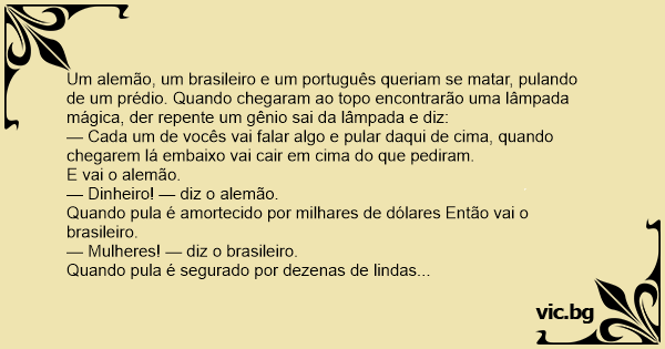 Um alemão, um brasileiro e um português queriam se matar, pulando de um prédio. Quando chegaram ao topo encontrarão uma lâmpada mágica, der repente um gênio sai da lâmpada e diz: