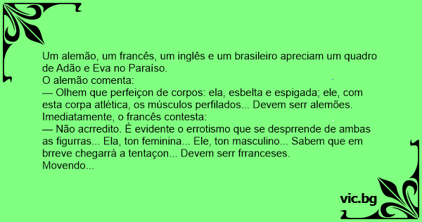 Um alemão, um francês, um inglês e um brasileiro apreciam um quadro de Adão e Eva no Paraíso.