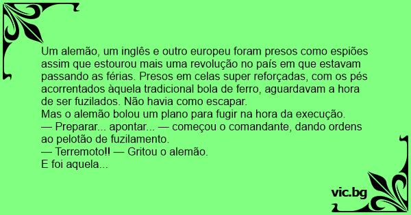 Um alemão, um inglês e outro europeu foram presos como espiões assim que estourou mais uma revolução no país em que estavam passando as férias. Presos em celas super reforçadas, com os pés acorrentados àquela tradicional bola de ferro, aguardavam a hоrа de ser fuzilados. Não havia como escapar.