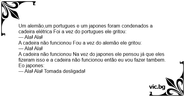 Um alemão,um portugues e um japones foram condenados a cadeira elétrica Foi a vez do portugues ele gritou: — Ala! Ala! A cadeira não funcionou Fou a vez do alemão ele gritou: — Ala! Ala! A cadeira não funcionou Na vez do japones ele pensou já que eles fizeram isso e a cadeira não funcionou então eu vou fazer tambem. Eo japones: — Ala! Ala! Tomada desligada!