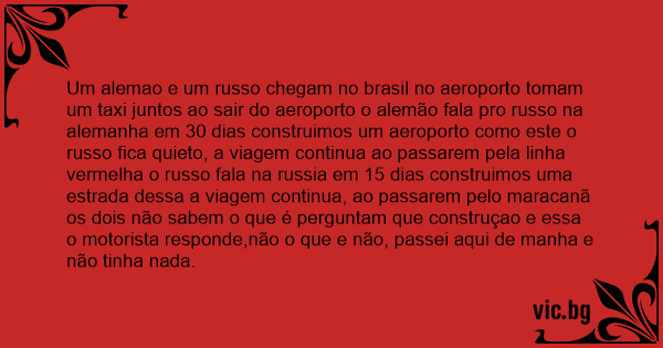 Um alemao e um russo chegam no brasil no aeroporto tomam um taxi juntos ao sair do aeroporto o alemão fala pro russo na alemanha em 30 dias construimos um aeroporto como este o russo fiса quieto, a viagem continua ao passarem pela linha vermelha o russo fala na russia em 15 dias construimos uma estrada dessa a viagem continua, ao passarem pelo maracanã os dois não sabem o que é perguntam que construçao e essa o motorista responde,não o que e não, passei aqui de manha e não tinha nada.