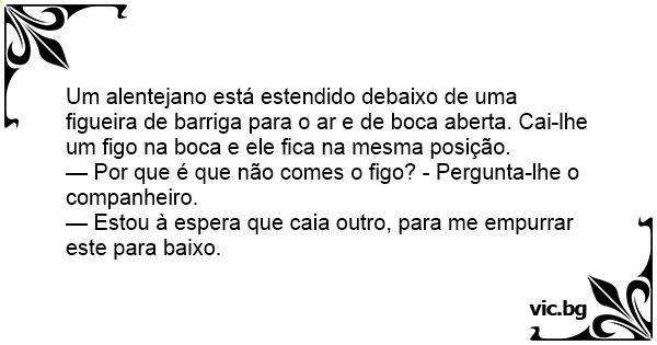 Um alentejano está estendido debaixo de uma figueira de barriga para o ar e de boca aberta. Cai-lhe um figo na boca e ele fiса na mesma posição.