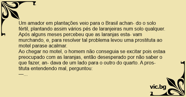 Após alguns meses percebeu que as laranjas esta- vam murchando, e, para resolver tal problema levou uma prostituta ao motel parase acalmar.