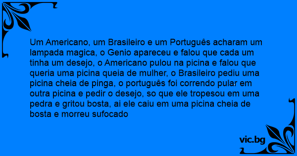 Um Americano, um Brasileiro e um Português acharam um lampada magica, o Genio apareceu e falou que cada um tinha um desejo, o Americano pulou na picina e falou que queria uma picina queia de mulher, o Brasileiro pediu uma picina cheia de pinga, o português foi correndo pular em outra picina e pedir o desejo, so que ele tropesou em uma pedra e gritou bosta, ai ele caiu em uma picina cheia de bosta e morreu sufocado