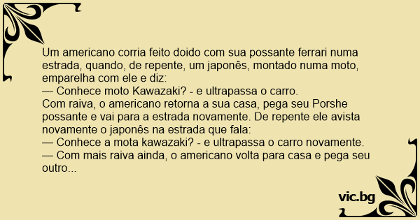 Um americano corria feito doido com sua possante ferrari numa estrada, quando, de repente, um japonês, montado numa moto, emparelha com ele e diz: