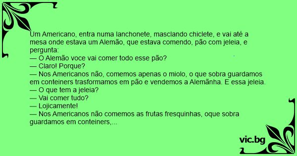 Um Americano, entra numa lanchonete, masclando chiclete, e vai até a mesa onde estava um Alemão, que estava comendo, pão com jeleia, e pergunta: