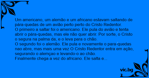 Um americano, um alemão e um africano estavam saltando de pára-quedas de um avião perto perto do Cristo Redentor.
