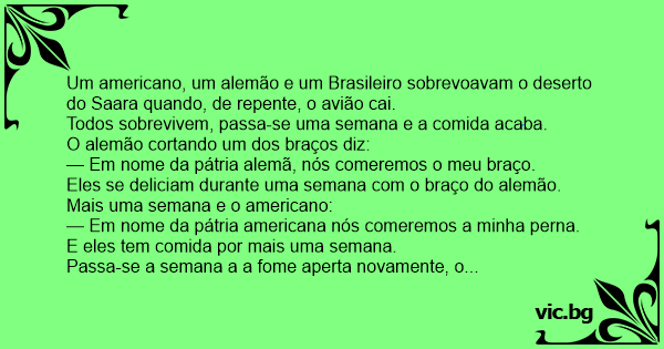 Um americano, um alemão e um Brasileiro sobrevoavam o deserto do Saara quando, de repente, o avião cai.
