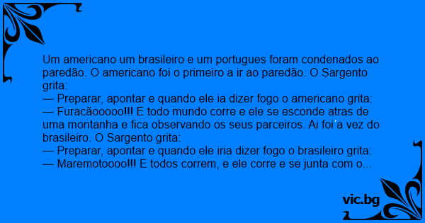 Um americano um brasileiro e um portugues foram condenados ao paredão. O americano foi o primeiro a ir ao paredão. O Sargento grita: