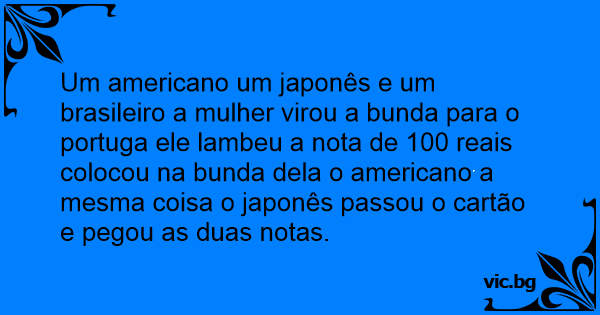 Um americano um japonês e um brasileiro a mulher virou a bunda para o portuga ele lambeu a nota de 100 reais colocou na bunda dela o americano a mesma coisa o japonês passou o cartão e pegou as duas notas.