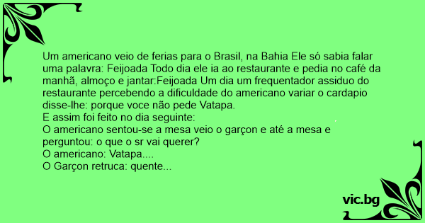 Um americano veio de ferias para o Brasil, na Bahia Ele só sabia falar uma palavra: Feijoada Todo dia ele ia ao restaurante e pedia no café da manhã, almoço e jantar:Feijoada Um dia um frequentador assiduo do restaurante percebendo a dificuldade do americano variar o cardapio disse-lhe: porque voce não pede Vatapa.