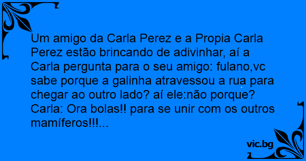 Um amigo da Carla Perez e a Propia Carla Perez estão brincando de adivinhar, aí a Carla pergunta para o seu amigo: fulano,vc sabe porque a gаlinhа atravessou a rua para chegar ao outro lado? aí ele:não porque? Carla: Ora bolas!! para se unir com os outros mamíferos!!!...