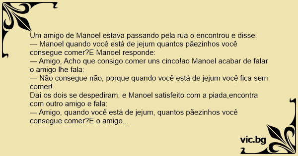 Daí os dois se despediram, e Manoel satisfeito com a piada,encontra com outro amigo e fala: