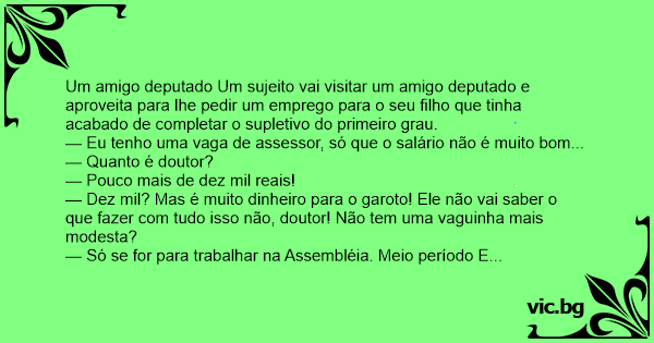 Um amigo deputado Um sujeito vai visitar um amigo deputado e aproveita para lhe pedir um emprego para o seu filho que tinha acabado de completar o supletivo do primeiro grau.
