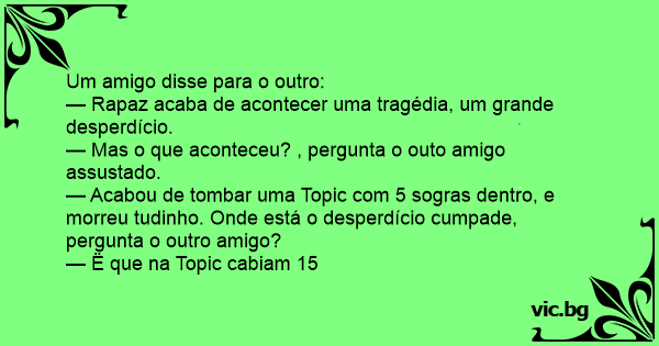— Acabou de tombar uma Topic com 5 sogras dentro, e morreu tudinho. Onde está o desperdício cumpade, pergunta o outro amigo?