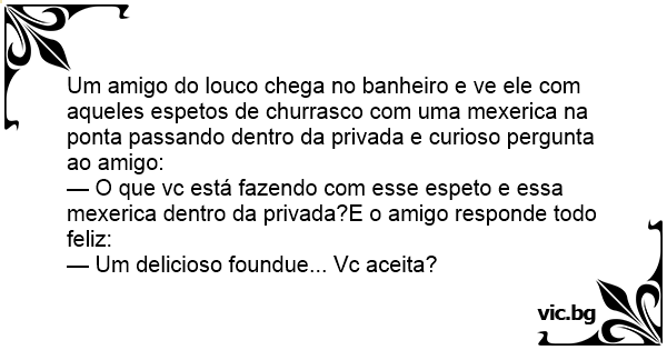 Um amigo do louco chega no banheiro e ve ele com aqueles espetos de churrasco com uma mexerica na ponta passando dentro da privada e curioso pergunta ao amigo: