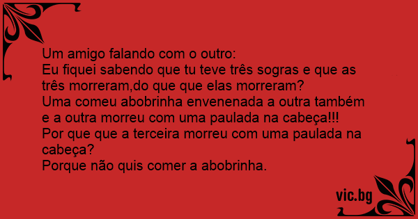 Uma comeu abobrinha envenenada a outra também e a outra morreu com uma paulada na cabeça!!!