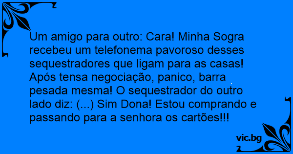 Um amigo para outro: Cara! Minha Sogra recebeu um telefonema pavoroso desses sequestradores que ligam para as casas! Após tensa negociação, panico, barra pesada mesma! O sequestrador do outro lado diz: (...) Sim Dona! Estou comprando e passando para a senhora os cartões!!!