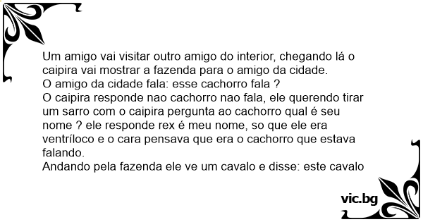 Andando pela fazenda ele ve um cavalo e disse: este cavalo fala ? o caipira responde nao cavalo nao fala, ele entao pergunta pro cavalo qual é seu nome e o ele disse Ventania e o meu nome, ele perguntou como te trata seu dono? e o cavalo:ele é legal me da comida me leva pra passear é muito legal. O caipira fiса espantado mas nao fala nada.