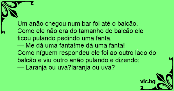 Um anão chegou num bar foi até o balcão. Como ele não era do tamanho do balcão ele ficou pulando pedindo uma fanta. — Me dá uma fanta!me dá uma fanta! Como níguem respondeu ele foi ao outro lado do balcão e viu outro anão pulando e dizendo: — Laranja ou uva?laranja ou uva?