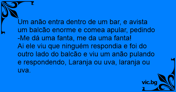 Um anão entra dentro de um bar, e avista um balcão enorme e comea apular, pedindo -Me dá uma fanta, me da uma fanta!