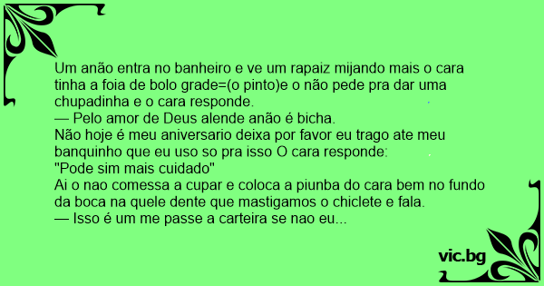 Um anão entra no banheiro e ve um rapaiz mijando mais o cara tinha a foia de bolo grade=(o pinto)e o não pede pra dar uma chupadinha e o cara responde.