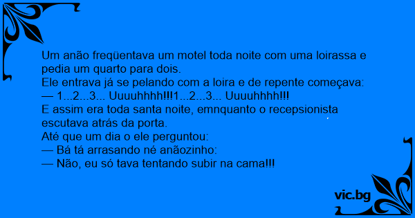 Um anão freqüentava um motel toda noite com uma loirassa e pedia um quarto para dois.
