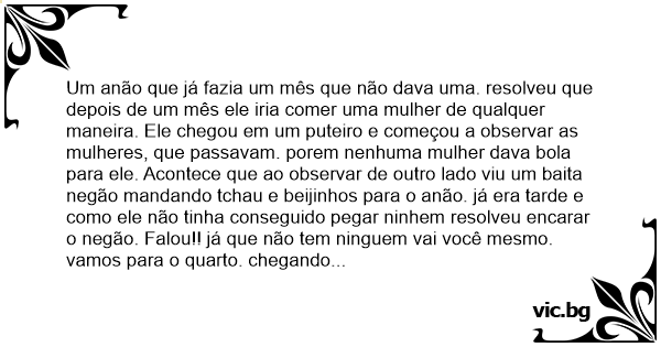 Um anão que já fazia um mês que não dava uma. resolveu que depois de um mês ele iria comer uma mulher de qualquer maneira. Ele chegou em um puteiro e começou a observar as mulheres, que passavam. porem nenhuma mulher dava bola para ele. Acontece que ao observar de outro lado viu um baita negão mandando tchau e beijinhos para o anão. já era tarde e como ele não tinha conseguido pegar ninhem resolveu encarar o negão. Falou!! já que não tem ninguem vai você mesmo. vamos para o quarto. chegando no quarto o anão perguntou para o NEGÃO de que ele gostava. Para a surpresa do anão, o negão respondeu: eu gosto de comer CÚ de anão e trancou a porta. vendo que não tinha para onde correr o anão resolveu dá para o negão. depois de tudo terminado e o anão com aquela dor terrivel em seu cú. O negão falou:ANÃO não fique preocupado se alguém perguntar você pode dizer que eu sou o viаdо. todo mundo pensa mesmo...