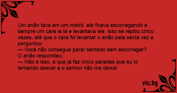Um anão tava em um metrô. ele ficava escorregando e sempre um cara ia lá e levantava ele, isso se repitiu cinco vezes, até que o cara foi levantar o anão pela sexta vez e perguntou: