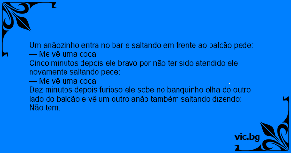 Dez minutos depois furioso ele sobe no banquinho olha do outro lado do balcão e vê um outro anão também saltando dizendo: