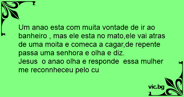 Um anao esta com muita vontade de ir ao banheiro , mas ele esta no mato,ele vai atras de uma moita e comeca a саgаr,de repente passa uma senhora e olha e diz.