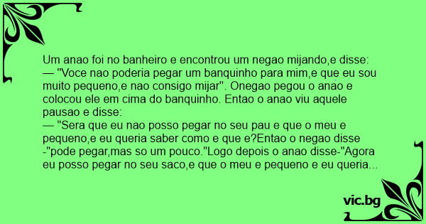 — "Sera que eu nao posso pegar no seu раu e que o meu e pequeno,e eu queria saber como e que e?Entao o negao disse-"pode pegar,mas so um pouco."Logo depois o anao disse-"Agora eu posso pegar no seu saco,e que o meu e pequeno e eu queria ver como e que e?"Eo negao respondeu: