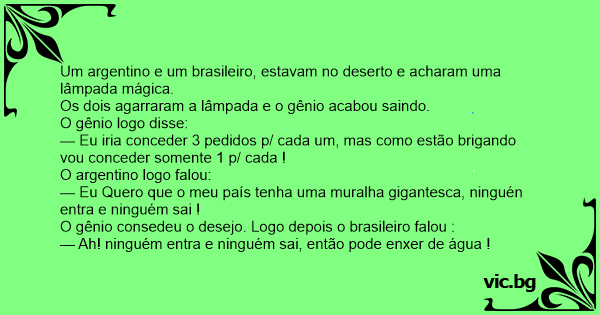 Um argentino e um brasileiro, estavam no deserto e acharam uma lâmpada mágica.