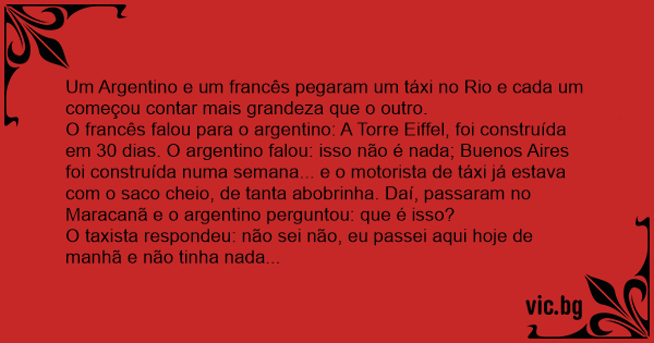 O francês falou para o argentino: A Torre Eiffel, foi construída em 30 dias. O argentino falou: isso não é nada; Buenos Aires foi construída numa semana... e o motorista de táxi já estava com o saco cheio, de tanta abobrinha. Daí, passaram no Maracanã e o argentino perguntou: que é isso?