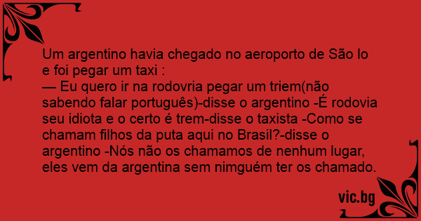 — Eu quero ir na rodovria pegar um triem(não sabendo falar português)-disse o argentino -É rodovia seu idiота e o certo é trem-disse o taxista -Como se chamam filhos da рuта aqui no Brasil?-disse o argentino -Nós não os chamamos de nenhum lugar, eles vem da argentina sem nimguém ter os chamado.