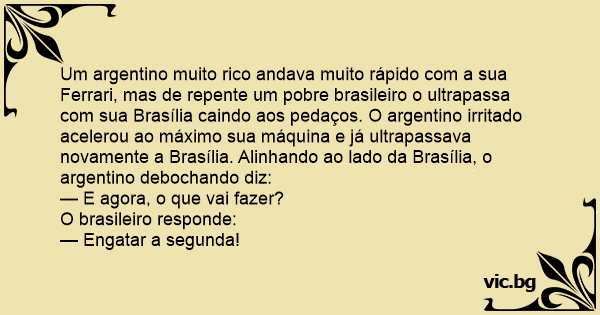 Um argentino muito rico andava muito rápido com a sua Ferrari, mas de repente um pobre brasileiro o ultrapassa com sua Brasília caindo aos pedaços. O argentino irritado acelerou ao máximo sua máquina e já ultrapassava novamente a Brasília. Alinhando ao lado da Brasília, o argentino debochando diz: