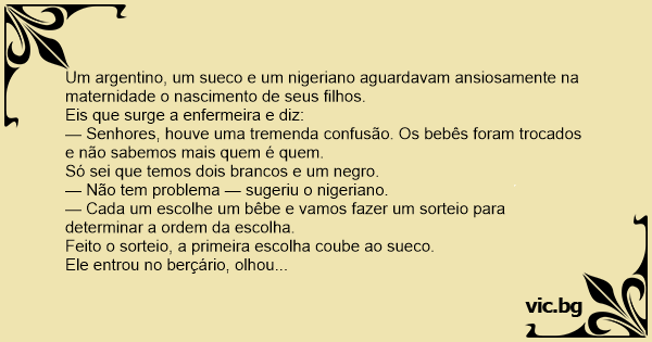 Um argentino, um sueco e um nigeriano aguardavam ansiosamente na maternidade o nascimento de seus filhos.