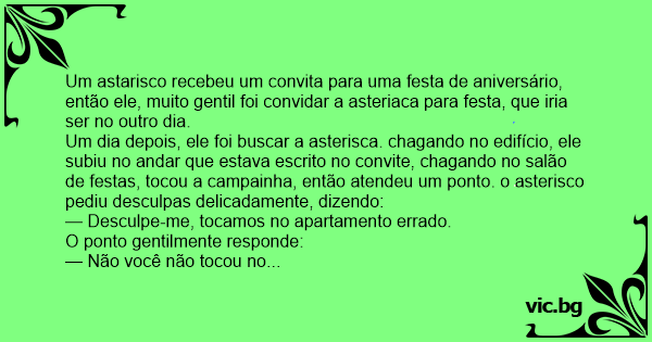 Um dia depois, ele foi buscar a asterisca. chagando no edifício, ele subiu no andar que estava escrito no convite, chagando no salão de festas, tocou a campainha, então atendeu um ponto. o asterisco pediu desculpas delicadamente, dizendo: