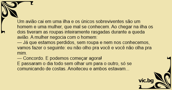 — Já que estamos perdidos, sem roupa e nem nos conhecemos, vamos fazer o seguinte: eu não olho pra você e você não olha pra mim.