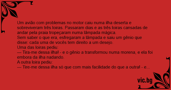 Um avião com problemas no motor caiu numa ilha deserta e sobreviveram três loiras. Passaram dias e as três loiras cansadas de andar pela praia tropeçaram numa lâmpada mágica.