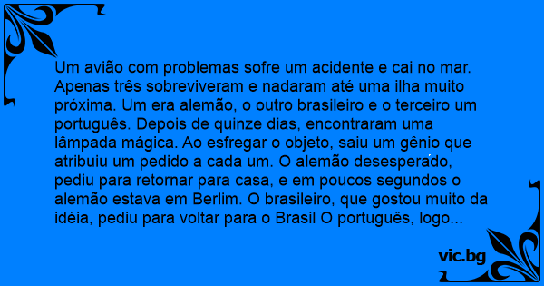 Um avião com problemas sofre um acidente e cai no mar. Apenas três sobreviveram e nadaram até uma ilha muito próxima. Um era alemão, o outro brasileiro e o terceiro um português. Depois de quinze dias, encontraram uma lâmpada mágica. Ao esfregar o objeto, saiu um gênio que atribuiu um pedido a cada um. O alemão desesperado, pediu para retornar para casa, e em poucos segundos o alemão estava em Berlim. O brasileiro, que gostou muito da idéia, pediu para voltar para o Brasil O português, logo em seguida, olhou para todos os lados da ilha, e apavoradamente disse: