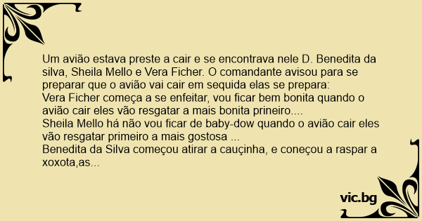 Um avião estava preste a cair e se encontrava nele D. Benedita da silva, Sheila Mello e Vera Ficher. O comandante avisou para se preparar que o avião vai cair em sequida elas se prepara: