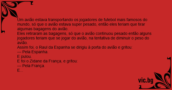 Um avião estava transportando os jogadores de futebol mais famosos do mundo, só que o avião estava super pesado, então eles teriam que tirar algumas bagagens do avião.
