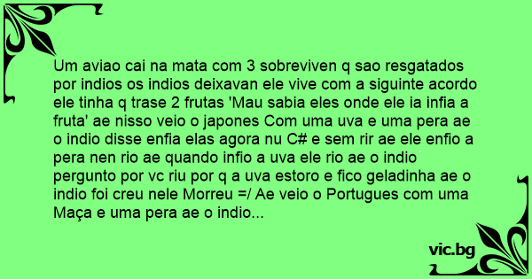 Um aviao cai na mata com 3 sobreviven q sao resgatados por indios os indios deixavan ele vive com a siguinte acordo ele tinha q trase 2 frutas 'Mau sabia eles onde ele ia infia a fruta' ae nisso veio o japones Com uma uva e uma pera ae o indio disse enfia elas agora nu C# e sem rir ae ele enfio a pera nen rio ae quando infio a uva ele rio ae o indio pergunto por vc riu por q a uva estoro e fico geladinha ae o indio foi creu nele Morreu =/ Ae veio o Portugues com uma Maça e uma pera ae o indio enfio a pera ele nen ligo ae depois a Maça o Brasileiro nen ligo no final ele rio do nada ae o indio pergunto por q vc ta rindo E PQ vem o alemao com uma jaca e uma melancia ali atraz kkkkkkkkkkkkkkkk Morau da piada Nu cu do sotro e refresco ^^ By : lorran ae o msn [email protected]