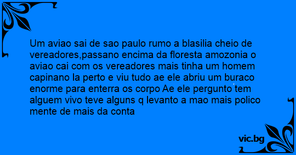 Um aviao sai de sao paulo rumo a blasilia cheio de vereadores,passano encima da floresta amozonia o aviao cai com os vereadores mais tinha um homem capinano la perto e viu tudo ae ele abriu um buraco enorme para enterra os corpo Ae ele pergunto tem alguem vivo teve alguns q levanto a mao mais polico mente de mais da conta