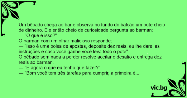 O bêbado sem nada a perder resolve aceitar o desafio e entrega dez reais ao barman.