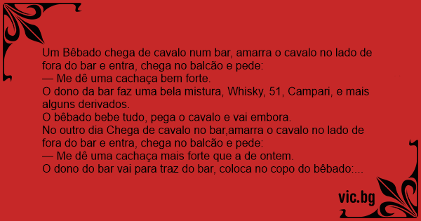 Um Bêbado chega de cavalo num bar, amarra o cavalo no lado de fora do bar e entra, chega no balcão e pede: