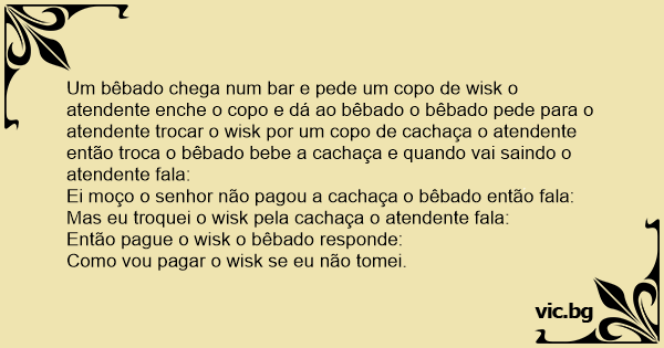 Um bêbado chega num bar e pede um copo de wisk o atendente enche o copo e dá ao bêbado o bêbado pede para o atendente trocar o wisk por um copo de cachaça o atendente então troca o bêbado bebe a cachaça e quando vai saindo o atendente fala: