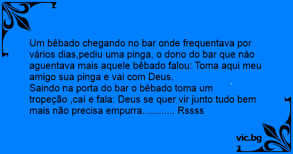 Um bêbado chegando no bar onde frequentava por vários dias,pediu uma pinga, o dono do bar que nào aguentava mais aquele bêbado falou: Toma aqui meu amigo sua pinga e vai com Deus.